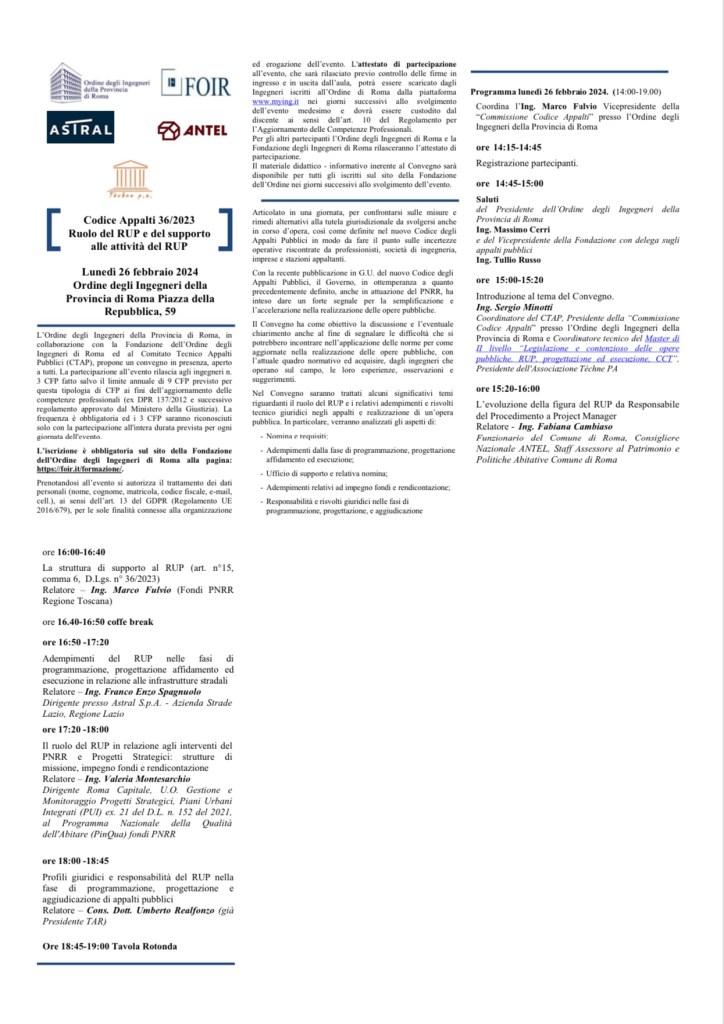 Il 12 luglio 2023 si è concluso il ciclo dei 5 Convegni sul nuovo Codice dei Contratti (uno per ogni libro) organizzato dall’Ordine degli Ingegneri della Provincia di Roma e dalla propria FOIR – Fondazione Ordine Ingegneri Roma, per il tramite del Comitato tecnico Appalti Pubblici (CTAP).