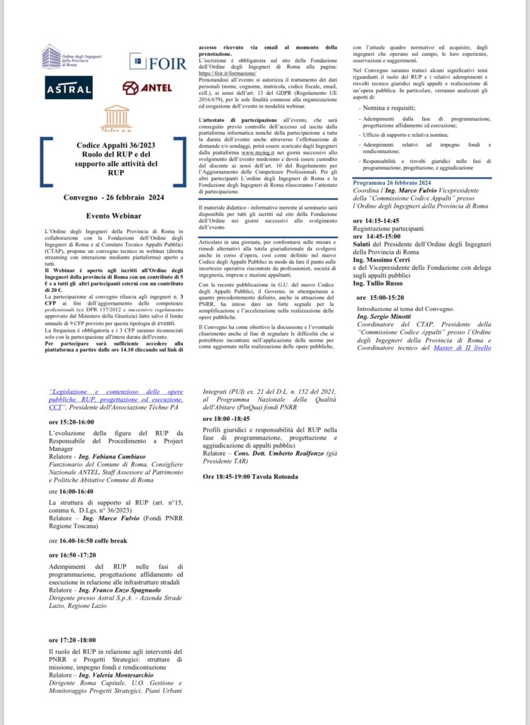 Il 12 luglio 2023 si è concluso il ciclo di cinque convegni sul Nuovo Codice Appalti, D.lgs. 36/2023, organizzato dalla Fondazione Ordine degli Ingegneri di Roma (FOIR) tramite il suo Comitato tecnico Appalti Pubblici (CTAP). E’ stata un’occasione di confronto tra gli esperti tecnici, giuristi e professionisti del settore, che ha messo in evidenza luci e ombre della nuova normativa. Un bilancio però tutto sommato positivo, che richiederà certo aggiustamenti in corso d’opera, ma che nel contempo fa ben sperare e prefigurare una nuova stagione per il mercato degli appalti pubblici. In allegato la locandina del Convegno e il materiale didattico messo a disposizione da parte dei relatori ai quali va il mio particolare ringraziamento per la qualità dei loro interventi.