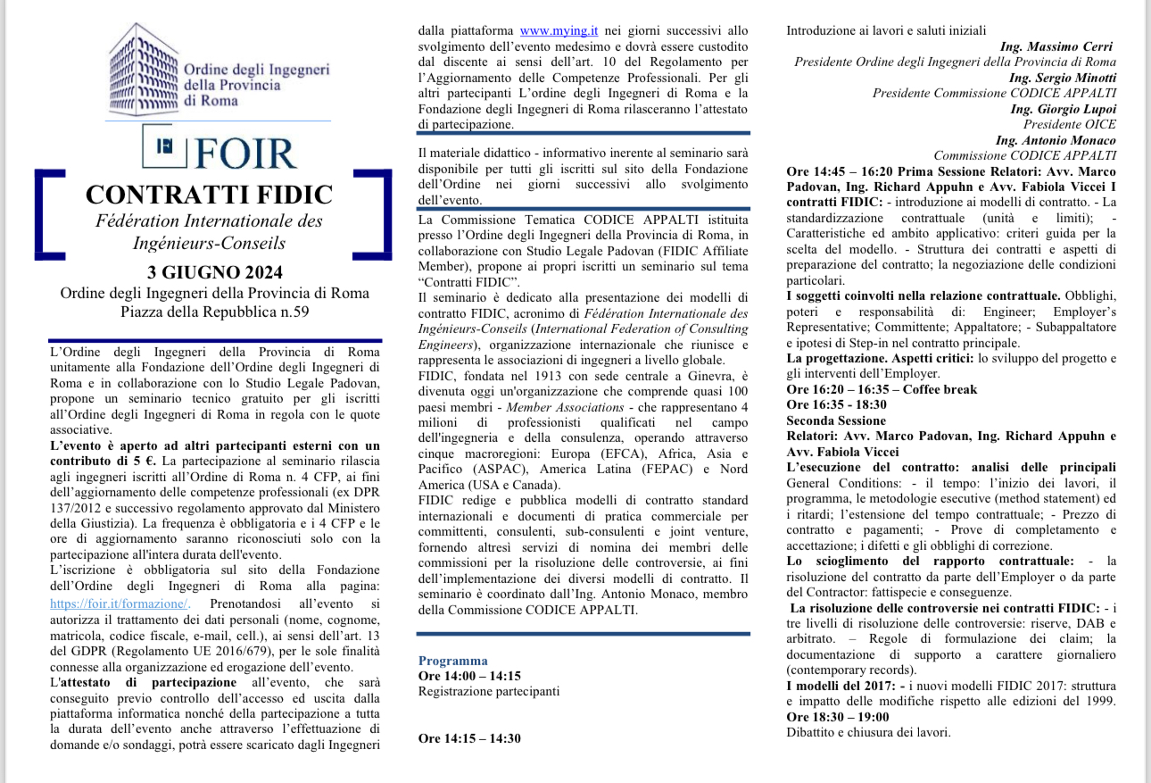 Il 3 giugno 2024 la Commissione Tematica CODICE APPALTI istituita presso l’Ordine degli Ingegneri della Provincia di Roma, in collaborazione con Studio Legale Padovan (FIDIC Affiliate Member), propone ai propri iscritti un seminario sul tema “Contratti FIDIC”.