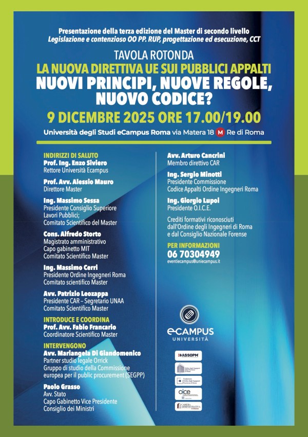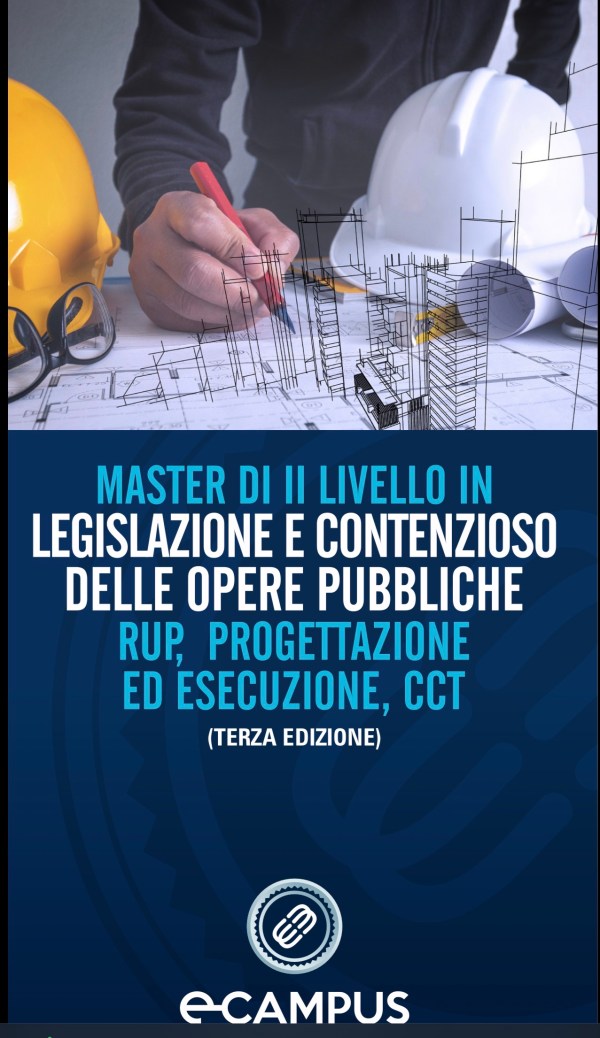 Ne parleremo diffusamente Il 30 Novembre 2024 presso la sede dell’Università degli Studi eCampus in Via Matera 18 a Roma dove si terrà la presentazione della seconda edizione del Master universitario di 2° livello in “Legislazione e contenzioso delle OO.PP., RUP, progettazione ed esecuzione, CCT”, organizzata da eCAMPUS in collaborazione con Ordine degli Ingegneri della Provincia di Roma, FOIR – Fondazione Ordine Ingegneri Roma, Camera Amministrativa Romana, OICE e ASSOPM – Associazione Italiana Project Manager.