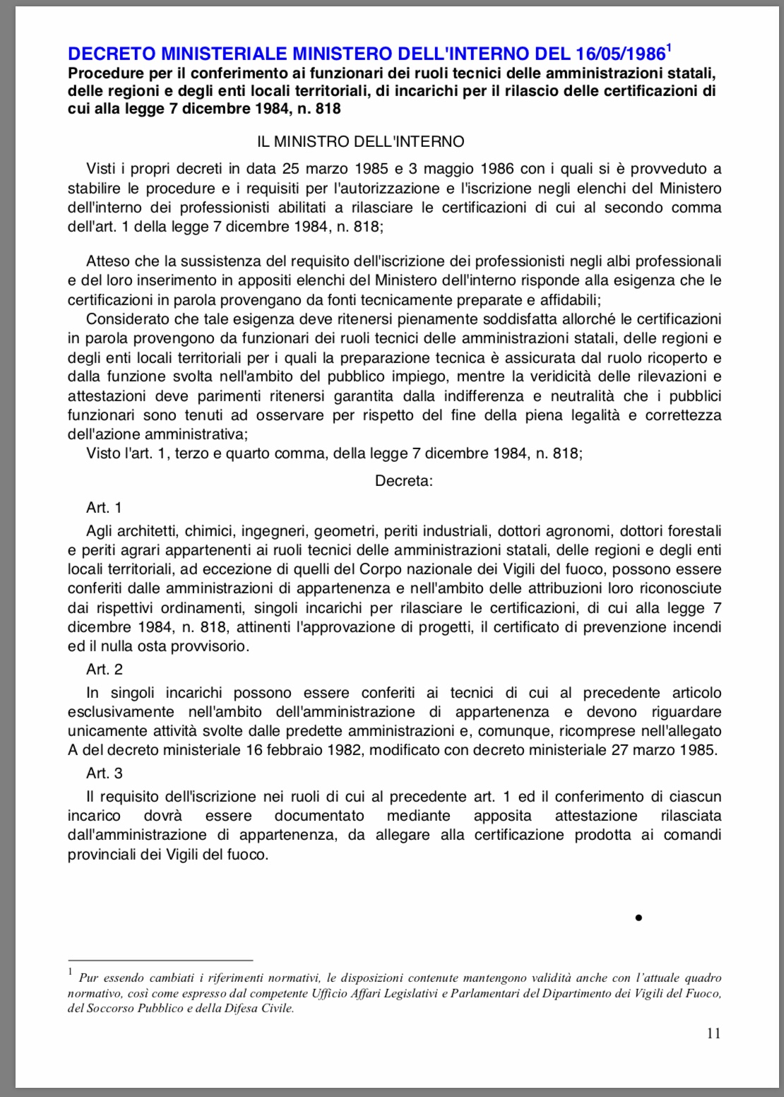 In merito ai dubbi circa l’obbligatorietà o meno di iscrizione dei funzionari tecnici dipendenti delle amministrazioni statali negli elenchi del Ministero dell’interno per il rilascio di certificazioni in materia antincendio e presentazione di pratiche SCIA o CPI, é dirimente il testo del DM 16.5.86, tutt’ora in vigore, che esclude tale obbligo per i funzionari destinatari di incarichi conferiti dalle amministrazioni di appartenenza. Lo stesso va altresì coordinato con l’obbligo, valido per tutti i professionisti antincendio, di aver seguito il “corso base di 120 ore” e i suoi aggiornamenti, nonché come previsto dallo stesso DM, con il possesso di adeguata preparazione tecnica rispetto all’incarico da assolvere e alla funzione ricoperta, dovendosi intendere – a parere di chi scrive – la possibilità di espletare l’incarico in base alla complessitá dello stesso commisurata all’esperienza professionale, nonché come sempre ai carichi di lavoro. La materia é particolarmente delicata in quanto connessa ad esigenze di sicurezza pubblica. Non dobbiamo dimenticare infatti che il professionista antincendio é garante in quanto pubblico funzionario della legalità e correttezza dell’azione amministrativa, che si estrinseca, nel caso di specie, attraverso l’erogazione di una prestazione tecnicamente affidabile, della quale risponde personalmente sia dal punto di vista civile, sia penale. È finanche pleonastico pertanto affermare che al di là del formale possesso dei requisiti di idoneità tecnica e professionale gli incaricati debbano garantire l’efficacia della prestazione, nel prioritario interesse della salvaguardia della salute e sicurezza pubblica. E ciò astenendosi laddove l’incarico esorbita le proprie capacità, nel rispetto dei codici di deontologia professionale e di comportamento.