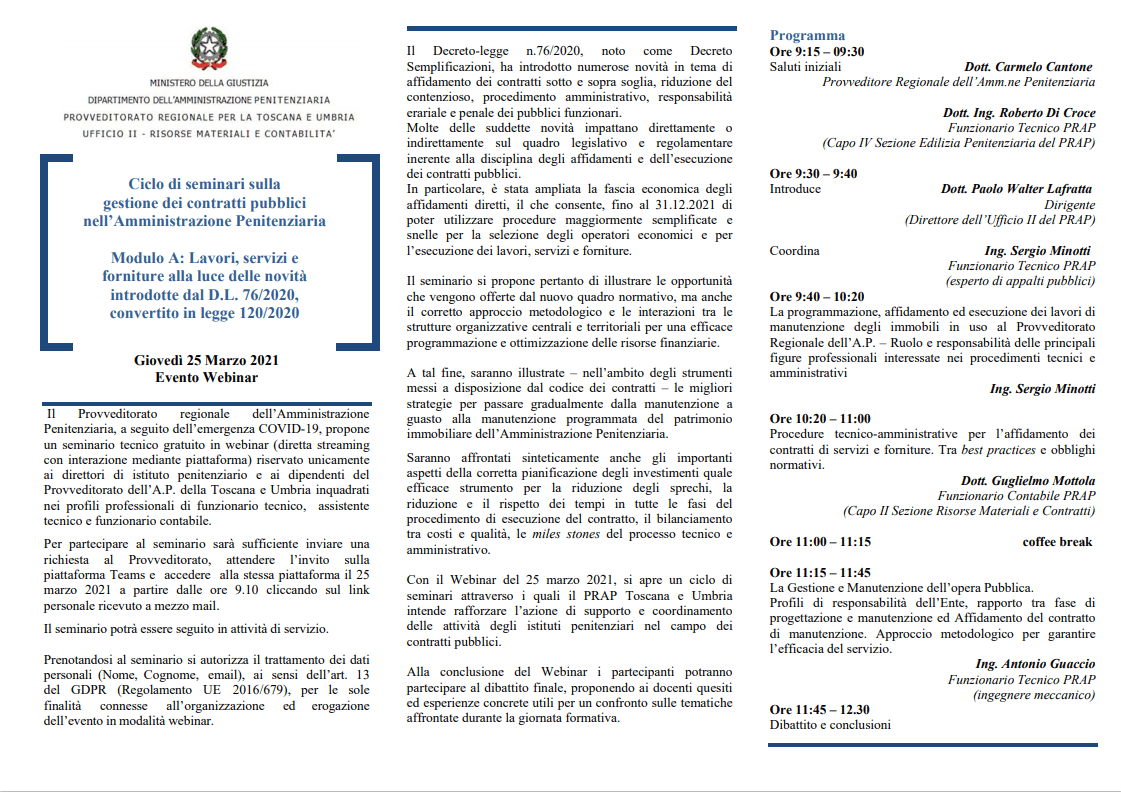 Ciclo di seminari sulla gestione dei contratti pubblici nell’Amministrazione Penitenziaria Modulo A: Lavori, servizi e forniture alla luce delle novità introdotte dal D.L. 76/2020, convertito in legge 120/2020.