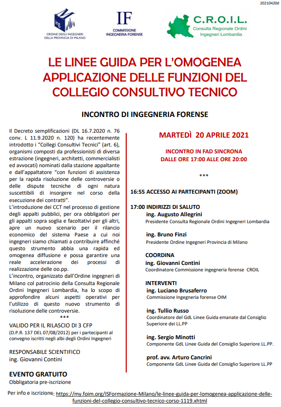 L’istituzione del CCT, anche nella fase antecedente l’esecuzione del contratto, è pertanto da ritenersi essenziale per garantire l’efficace e sollecito affidamento dei lavori, in special modo per le opere particolarmente complesse, come quelle strategiche volte al rilancio Paese, tra le quali saranno ricomprese quelle del Piano Nazionale di Ripresa e Resilienza (PNRR), da finanziarsi con le risorse del Recovery Fund.